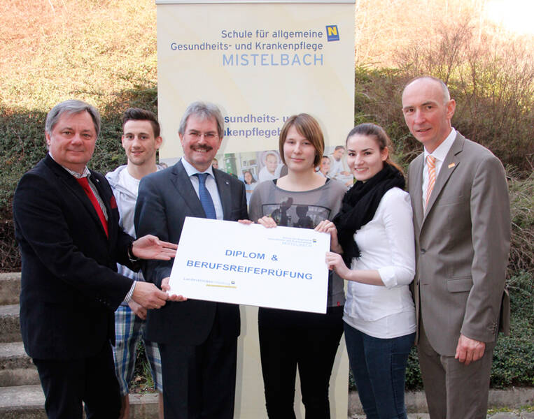 Diplom und Berufsreifeprüfung – das macht Sinn, meinen auch Landesrat Mag. Karl Wilfing, der stv. Medizinische Geschäftsführer der NÖ Landeskliniken-Holding Dr. Markus Klamminger und der Direktor der Schule für Gesundheits- und Krankenpflege DGKP Johannes Rieder sowie die Schüler Valentina Gutmayer, Katharina Gruber und Michael Dick.