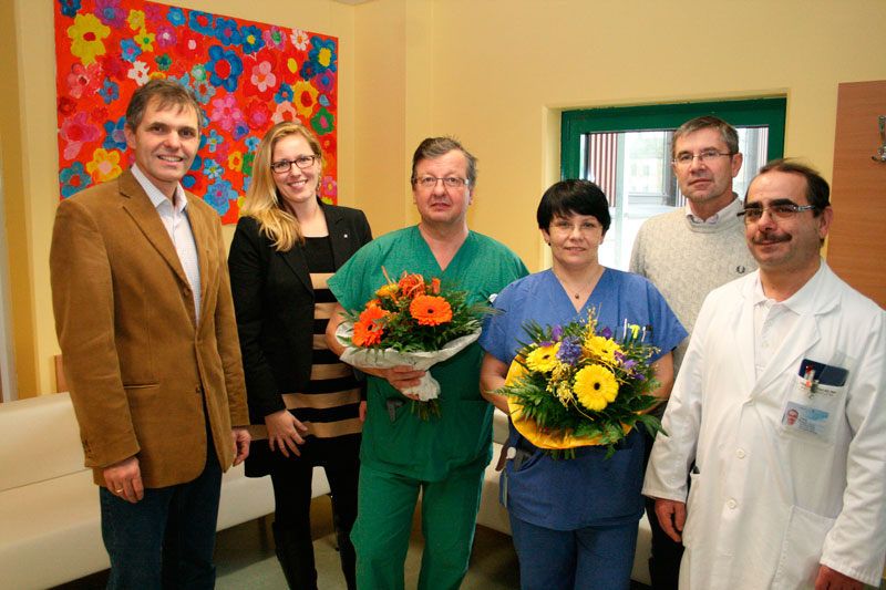 Für Stationsleiterin DGKS Martha Wittmann und Abteilungsvorstand Prim. Dr. Harald Penz gab es Blumen zum 30-jährigen Bestehen der Abteilung für Anästhesie und Intensivmedizin.