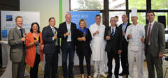 (v.l.) Herfried Pauser (Zielgruppenmanager, HYPO NOE Landesbank), Susann Gamper (Betriebsrat), Mag. Armin Wodiczka (Regionaldirektor Waldviertel, HYPO NOE Landesbank), DI Franz Laback (kaufm. Direktor), Siegrun Karner (Pflegedirektorin), Prim. Dr. Heinz Jünger (ärztl. Direktor), Bernhard Gintenstorfer (Leiter der HYPO NOE-Geschäftsstelle im Universitätsklinikum), Dr. Josef Sattler (Betriebsrat), Robert Steiner (Küchenleiter), Christian Rädler (Stv. Vorstand, HYPO NOE Landesbank)