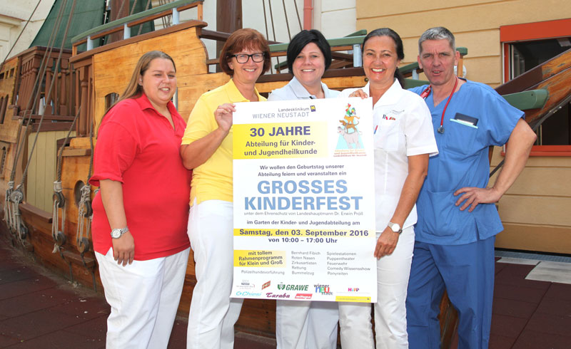 Die Abteilung für Kinder- und Jugendheilkunde im Landesklinikum Wiener Neustadt kann im heurigen Jahr stolz auf 30 ereignisreiche Jahre zurückblicken. Aus diesem besonderen Anlass findet am Samstag, den 3. September 2016 von 10 bis 17 Uhr ein großes Kinderfest, das unter dem Ehrenschutz von Landeshauptmann Dr. Erwin Pröll steht, im Garten der Kinder- und Jugendabteilung statt.