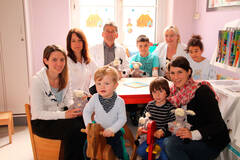 Freuten sich über die kuscheligen „Emils“: (v.l.) Claudia und Benjamin Ecker, Simon, Marisa Winkler von Bosch Marketing, 2. Reihe: Prim. Dr. Jutta Falger, MSc, MBA (Leiterin der Abteilung für Kinder- und Jugendheilkunde), Pflegedirektor DGKP Josef L. Strobl, akad. PD, Marvin Schweiger, Bereichsleitung Eltern-Kind DKKS Karina Rameis und Jessica Hagley
