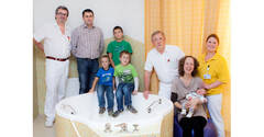 (v.l.) OA Dr. Rudolf Bind, Stefan Grünstäudl, die Brüder Benedikt, Michael und Simon Grünstäudl, Prim. Dr. Gerhard Wolfram, Renate Grünstäudl mit dem Jubiläumsbaby Antonia Johanna, Hebamme Susanne Weiss