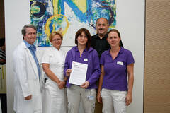 (v.l.) Ärztlicher Standortleiter Prim. Dr. Michael Böhm, Pflegerische Standortleiterin Herta Weissensteiner, MBA, Kaufmännischer Standortleiter Dipl. KH-BW Karl Binder und Palliativkoordinatorin DGKS Alexandra Stacke freuen sich mit Diplomsozialarbeiterin Petra Bauer