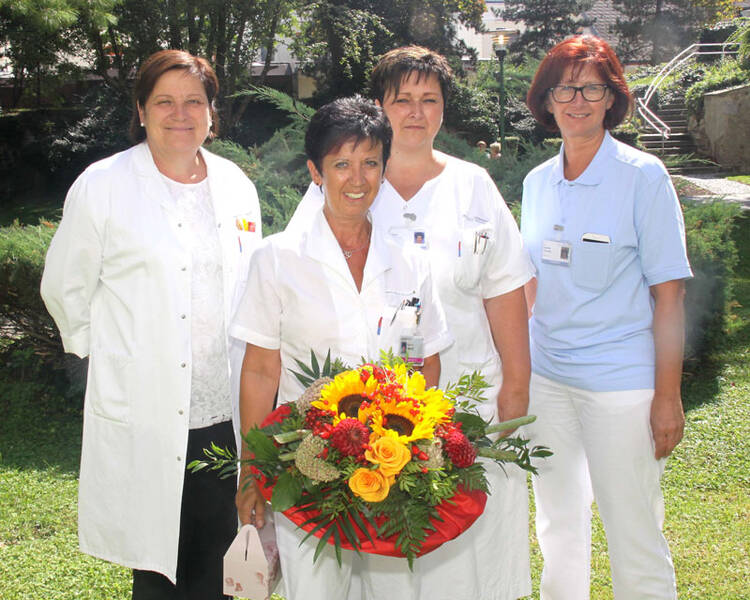 (v.l.) Pflegedirektorin Dr. Evelyn Fürtinger, MAS, Stationsleiterin DGKS Maria Tschepp und Bereichsleiterin DKKS Evelyne Peinsipp, MSc wünschen Pflegehelferin Roswitha Samitz (2. v.l.) alles Gute im Ruhestand.