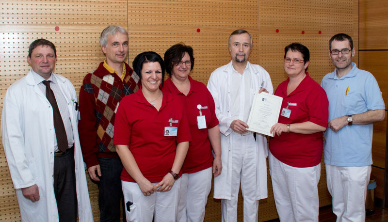(v.l.) Kaufmännischer Standortleiter Dipl. KH-BW Franz Waldecker, OA Dr. Martin Mikesch, DGKS Dagmar Zinner, DGKS Rita Pfeiffer, Ärztlicher Direktor Prim. Univ. Doz. Dr. Manfred Weissinger, DGKS Lucia Burger und Pflegerischer Standortleiter Andreas Lausch, MAS, MBA, MSc.