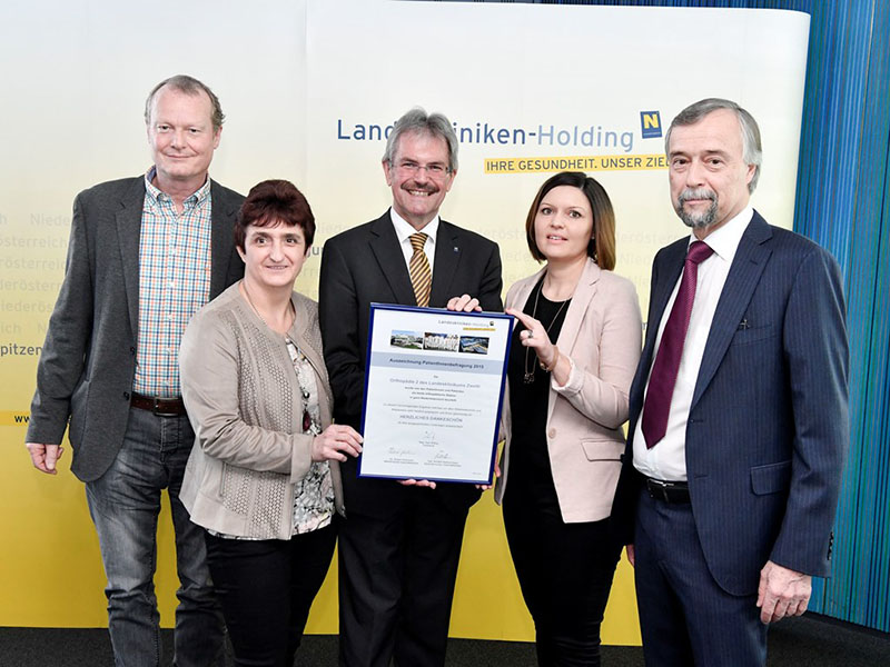 Bei der letztjährigen Patientenbefragung konnte sich die Abteilung der „Ortho 2“ neben der bisher schon weithin bekannten fachlichen Reputation auch noch die Auszeichnung als beste Orthopädiestation in Niederösterreich sichern. Abteilungsleiter Prim. Prof. Univ.-Doz. Dr. Manfred Weissinger erfreut: „Wir sind sehr stolz auf diese Auszeichnung durch unsere Patientinnen und Patienten, deren Zufriedenheit und Vertrauen sind uns sehr wichtig. Ich gratuliere unserem gesamten Team dazu.“