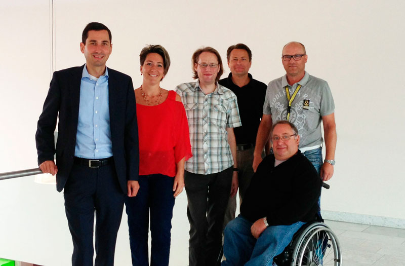 (v.l.) Mag. Dr. Bernhard Kadlec, Kaufmännischer Direktor LKP; Ing. Nina Krieger, Bau- und Feuerpolizei Magistrat St. Pölten; Thomas Tost, Club 81; DI Gerhard Mirth, Architekt Pfaffenbichler Ziviltechniker GmbH; Josef Schoisengeyer, Obmann Club 81 (im Rollstuhl); DI Wolfgang Lengauer, Bauprojektmanagement LKP