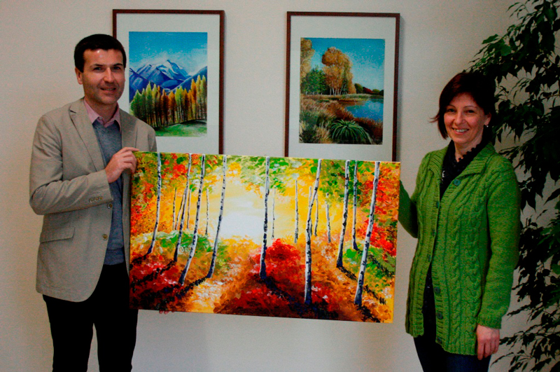 Hobbykünstlerin DGKS Regina Zeitlhofer und Kaufm. Direktor Mag. Klaus Watzinger präsentieren einige Ausstellungsstücke.