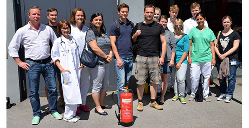 Im Anschluss folgt eine praktische Brandschutzschulung durch die Betriebsfeuerwehr des Universitätsklinikums St. Pölten. Hier wird unter anderem die korrekte Handhabung der verschiedenen Feuerlöscher sowie das richtige Verhalten im Brandfall vermittelt. Bei der Simulation eines Brandes können sich die neuen Kolleginnen und Kollegen mit dem Umgang eines Feuerlöschers vertraut machen.