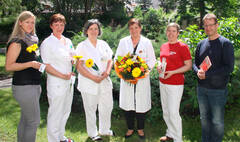 Mit Blumen bedankten sich die mobilen Pflegedienste der Caritas und das Mobile Caritas Hospiz stellvertretend für alle Mitarbeiterinnen und Mitarbeiter des Landesklinikums bei Pflegedirektorin Dr. Evelyn Fürtinger, MAS, der Oberärztin Dr. Ljiljana Durovic und DGKS Astrid Tschürtz vom Palliativkonsiliardienst für die ausgezeichnete Zusammenarbeit.