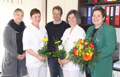 Mit einem wunderschönen Blumenstrauß bedankten sich die Caritas Regionalleiterin für Wiener Neustadt und Neunkirchen Manuela Ringhofer (l.) und August Rosenkranz (3.v.l.) bei Pflegedirektorin Dr. Evelyn Fürtinger, MAS, DGKS Maria Scheibenreif, OA Dr. Ljiljana Durovic und DGKS Astrid Tschürtz vom Palliativteam für die tatkräftige Unterstützung.