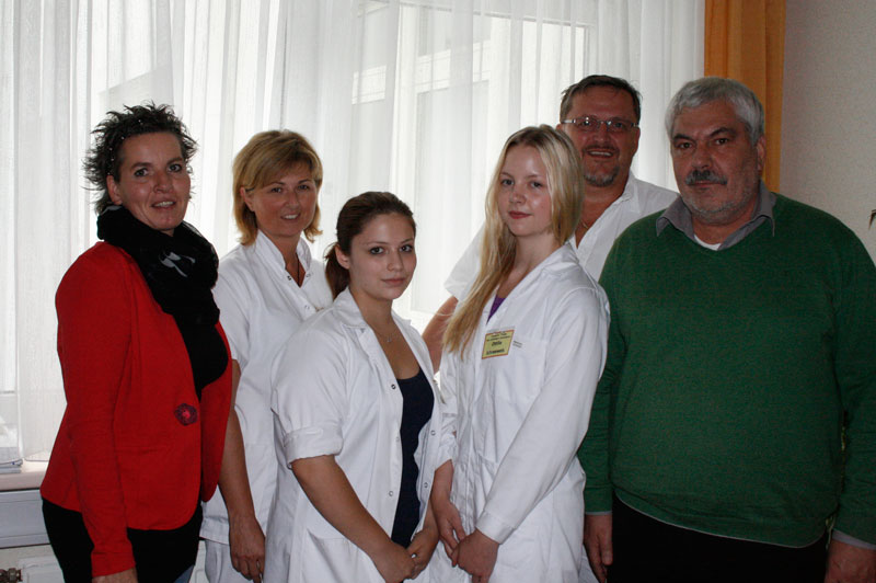 (v.l.) Pflegedirektorin Christa Grosz, MBA, DGKS Birgit Dissauer (Stv. Stationsführung Stat. B), Schülerin Anna Spreitzhofer, Schülerin Ottilie Schneeweis, DGKP Johann Wagner (Stationsführung Stat. L), Mag. Anton Eder (Lehrbeauftragter Gymnasium- und Realgymnasium Sachsenbrunn)