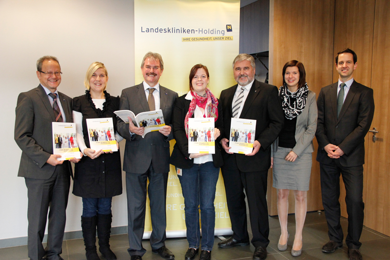 GF Dipl. KH-BW Helmut Krenn, Anita Riesenhuber, LR Mag. Karl Wilfing, Mag. Claudia Englstorfer, GF Dr. Robert Griessner, Mag. Isabella Haselsteiner, Mag. Georg Wokrinek mit dem druckfrischen Bildungskatalog 2014