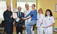 (v.l.) Oberbrandrat Werner Loidolt (Bezirksfeuerwehrkommandant), Mag. Franz Huber (Kaufmännischer Direktor), Prim. Univ.-Prof. Dr. Paul Bratusch-Marrain (Ärztlicher Direktor), Lisa Pröglhöf (Feuerwehrfrau aus Wolfsbach), DGKS Romana Strauß und DGKS Martina Wais (Interne Ambulanz)