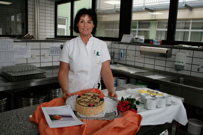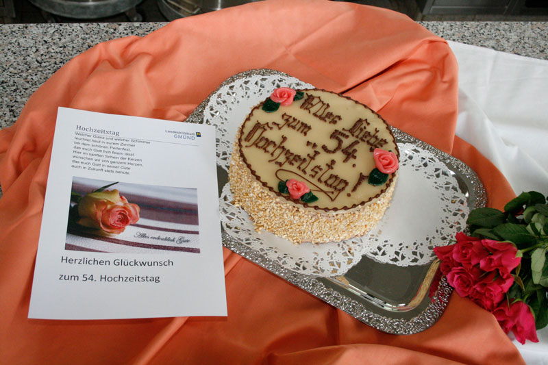 Um den Eheleuten trotzdem den Tag so angenehm als möglich zu gestalten überlegte sich das Team der Internen Abteilung 1 eine ganz besondere Überraschung. Küchenleiterin Gerda Dressler wurde informiert und sie zauberte gemeinsam mit ihrem Team eine dem Anlass entsprechende Torte samt Glückwunschschreiben.