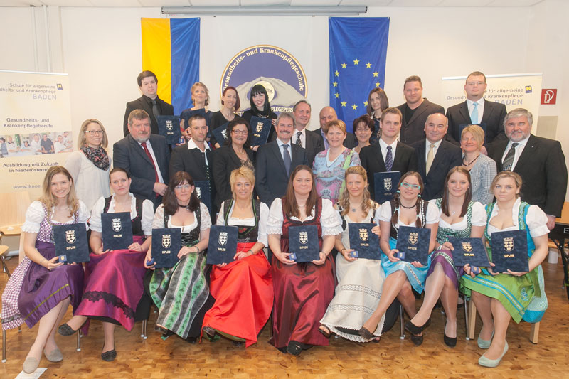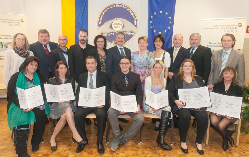 Doppelten Grund zur Freude gibt es an der Schule für allgemeine Gesundheits- und Krankenpflege Baden! 17 Diplomandinnen und Diplomanden haben nun ihre Ausbildung zur diplomierten Gesundheits- und Krankenschwester bzw. –pfleger abgeschlossen, 8 Absolventinnen und Absolventen haben die Ausbildung der psychiatrische Gesundheits- und Krankenpflege erfolgreich absolviert. Im Rahmen einer gemeinsamen Abschlussfeier im Festsaal der Schule für allgemeine Gesundheits- und Krankenpflege Baden nahmen sie von Landesrat Mag. Karl Wilfling ihre wohlverdienten Abschlusszeugnisse entgegen.