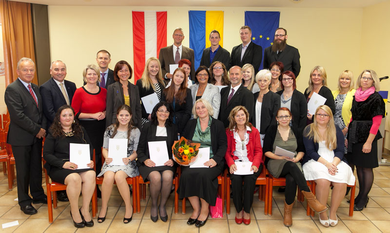Direktorin Regina Lang, MBA gratulierte den Absolventinnen und Absolventen gemeinsam mit LAbg. Bürgermeister Josef Balber, in Vertretung von LH Dr. Erwin Pröll, Bundesrätin Angela Stöckl, LAbg. Mag. Karin Scheele, Stadträtin Dir. Brigitte Gumilar, DI Alfred Zens, MBA, Regionalmanager Thermenregion der NÖ Landeskliniken-Holding, Mag. Elke Romirer vom BFI NÖ, und der Klinikleitung des Landesklinikums Baden-Mödling mit Prim. Univ. Doz. Dr. Johann Pidlich, Ärztlicher Direktor, Dipl. KH-BW Reinhard Fritz, Kaufmännischer Direktor und DGKS Katja Sacher, BSc, Stv. Pflegedirektor; Die Absolventinnen und Absolventen der Pflegehilfe-Ausbildung: Zagorka Andrejic, Stefan Bauer, Azra Cosic, Isabella Ernst, Sigrun Hauthaler, Christoph Hofer, Elizabeta Jevtic, Victoria Kammerzelt, Judita Kontarova, Victoria Leshem, Karin Münster, Mario Naimer, Anna Reittinger, Elisabeth Schwitzer, Michael Weber, Yvonne Zirrer