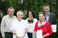 (v.l.) Ortsvorsteher und Obmann Helmuth Semmelmeyer, DGKS Silvia Hörmann, Pflegedirektorin DGKS Ingrid Czink, dipl. Sozialarbeiterin Elisabeth Zeller und Obmann-Stv. Ing. Günter Schnötzinger bei der Übergabe des Erlöses vom Benefiz-Glühweinstand
