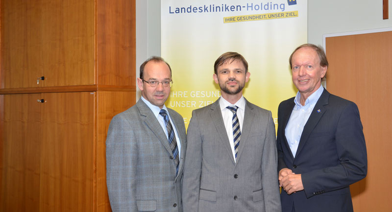 Der Kaufmännische Direktor Mag. Franz Huber und Regionalmanager Dr. Andreas Reifschneider begrüßen Prim. Dr. Roland Celoud (Mitte) in seiner neuen Funktion.