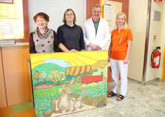 Ende 2016 übergab die Künstlerin ihr farbenfrohes Werk an Stationsleiterin DGKP Silvia Weiss und Abteilungsleiter Prim. Assoc. Prof. Dr. Harald Zaunschirm. Ein geeigneter Platz im Herzen der Station konnte dem Gemälde bereits gesichert werden.