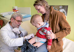 Prim. Univ.-Prof. Dr. Hans Salzer impft den kleinen Gabriel gegen Mumps-Masern-Röteln.