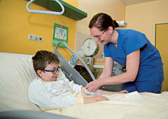 DGKS Karin Lohner wechselt den Venflon von David (8). Er hat eine leichte Gehirnerschütterung. Fotos: Felicitas Matern