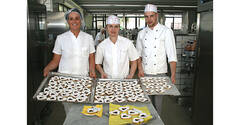 Küchenleiterin Gerda Dressler, Konditorin Helga Zrout und Küchenmitarbeiter Christoph Fuß mit den hausgemachten Muttertagsherzen.