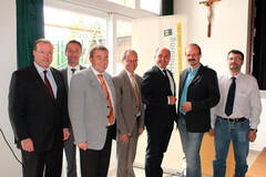 Über das neue Spitalsärztegesetz informierte Landeshauptmann-Stellvertreter Mag. Wolfgang Sobotka (3.v.r.) persönlich in allen Regionen des Landes, zum Abschluss im Landesklinikum Mistelbach-Gänserndorf. Mit dabei waren Mag. Andreas Achatz, Leiter der Abteilung Personalangelegenheiten B, der Regionalmanager Weinviertel DI Jürgen Tiefenbacher, Landesvorstands-Mitglied GÖD NÖ Eduard Böhm, der Kaufmännische Geschäftsführer der NÖ Landeskliniken-Holding Dipl. KH-BW Helmut Krenn, der Vizepräsident der NÖ Ärztekammer Dr. Ronald Gallob und der stv. Zentralbetriebsrats-Vorsitzende der NÖ Landeskrankenhäuser und NÖ Landespflegeheime, Gottfried Feiertag.