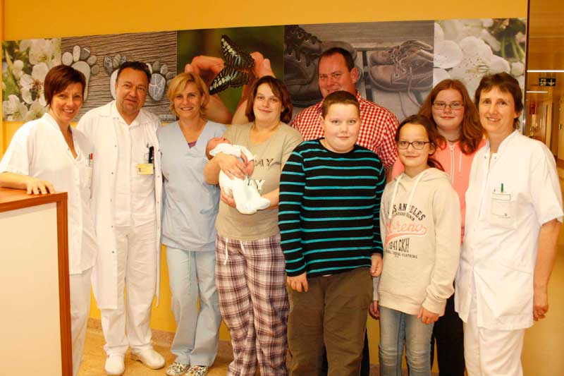DGKS Regina Zeitlhofer, OA Dr. Darko Tomica, Hebamme Judith Ziegler, Familie Schnabler mit Mama Claudia, Baby Emilian Martin, Papa Martin, den Geschwistern Sebastian, Lisa, Selina und stv. Stationsleitung DGKS Sabine Teufel