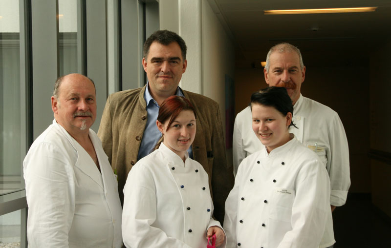 Die Zukunftswünsche der beiden Jungköchinnen: Janine Zeilinger würde gerne mal unter einem richtigen „Sterne-Koch“ mitarbeiten! Auf jeden Fall wird sie der Branche treu bleiben. Sabrina Zeitlhofers Herz gehört der Patisserie – aber sie ist sehr froh, beide Berufe gelernt zu haben. Der Kaufmännische Direktor Mag. (FH) Peter Hruschka gratuliert mit Küchenchef Ferdinand Brandhofer und Küchenleiter-Stv. Johann Dorrer den „Jung-Köchinnen“ zum erfolgreichen Lehrabschluss.