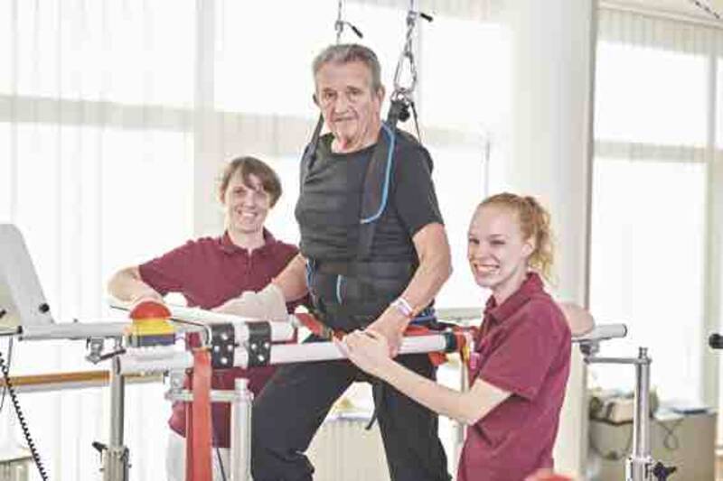 Der Patient ist halbseitig gelähmt. Am Pedago-Gerät muss er nun Gehen üben. Die Physiotherapeutinnen Katharina Nuc (l.) und Diana Denk (r.) leiten ihn an.