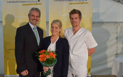 LR Mag. Karl Wilfing, Pflegehelfer Eckler Daniela von der Pulmologie, Pflegehelfer Spitzer Christian vom Hol- und Bringdienst