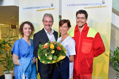 Landesrat Mag. Karl Wilfing (Mitte) mit den „Models“ DGKP Elisabeth Schleining, DGKP Theresa Hiller und Dr. Karl Gspandl (v.l.)