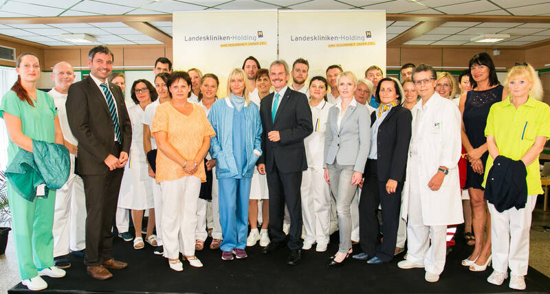 (v.l.) Die Models des LK Neunkirchen mit dem Kaufm. Direktor Dipl. KH-BW Johann Ungersböck, BR Evelin Lizzi, LR Mag. Karl Wilfing, Assistentin des Regionalmanagements Thermenregion Dipl. KH-BW Ingrid Schwarz MSc von der NÖ Landeskliniken-Holding, Ärztl. Direktor Prim. Dr. Gerhard Koinig MBA, Pflegedirektorin Maria Aichinger MSc MAS