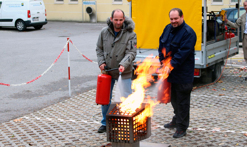 Nach einer kurzen theoretischen Einführung und Auffrischung der Information über das richtige Verhalten im Brandfall, wird im praktischen Teil durch jeden Teilnehmer ein Löschvorgang mittels Feuerlöscher geübt.