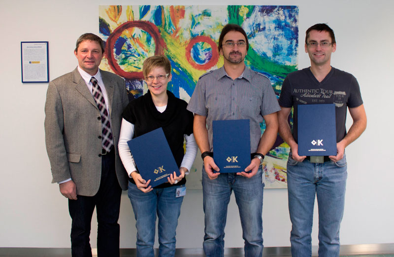 (v.l.) Dipl. KH-BW. Franz Waldecker gratuliert Monika Haag, Manfred Thor und Patrick Veith zum erfolgreichen Abschluss ihrer Ausbildungen