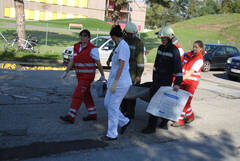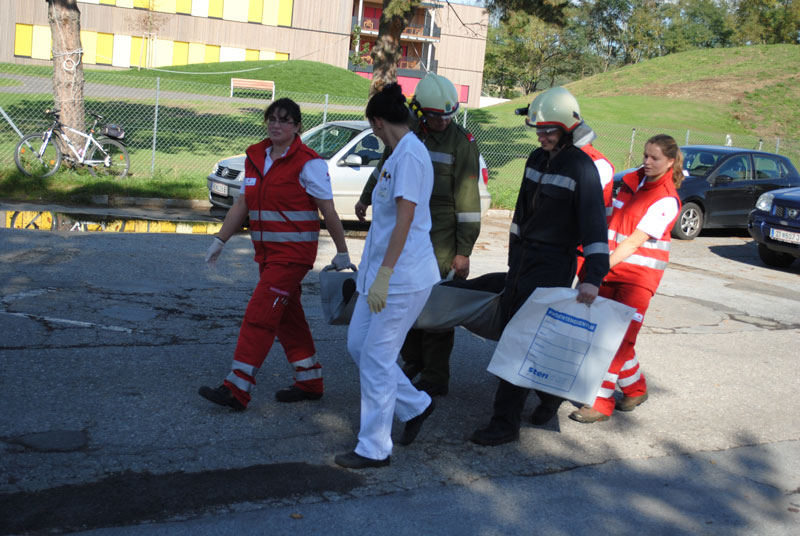 Gemeinsam mit Rotem Kreuz und Krankenhauspersonal werden die Patienten zur Sanitätshilfsstelle gebracht. (Copyright-Fotos: Karl Koll FF Mödring)