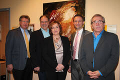 Künstlerin Mag. Astrid Aigner (2.v.r.) mit Laudator Bürgermeister Wolfram Erasim aus Rabensburg (2.v.l.) und dem Kaufmännischen Direktor Dipl. KH-BW Josef Kober sowie dem Ärztlichen Direktor Prim. Univ.-Doz. Dr. Otto Traindl (v.l.)