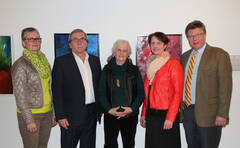 Künstler Dr. Peter Grundtner (4.v.l.) mit (v.l.) Regionalmanager DI Jürgen Tiefenbacher, Landesrat Mag. Karl Wilfing, dem Ärztlichen Direktor Prim. Univ.-Doz. Dr. Otto Traindl, seiner Gattin Dr. Jacqueline Cup-Grundtner und dem Kaufmännischen Direktor Josef Kober