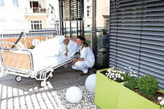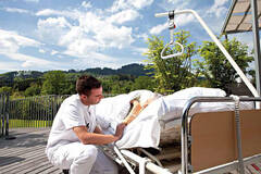 Im Einklang mit der Natur: Die Patientinnen von DGKP Mario Feichtegger und DGKS Michaela Winninger genießen die wärmenden Sonnenstrahlen auf der Terrasse.