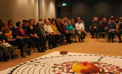 Über 100 Angehörige folgten der Einladung zum gemeinsamen Gedenken an Verstorbene. Bunte Herbstblätter befinden sich im Zentrum des verschlungenen Lebenslabyrinths.