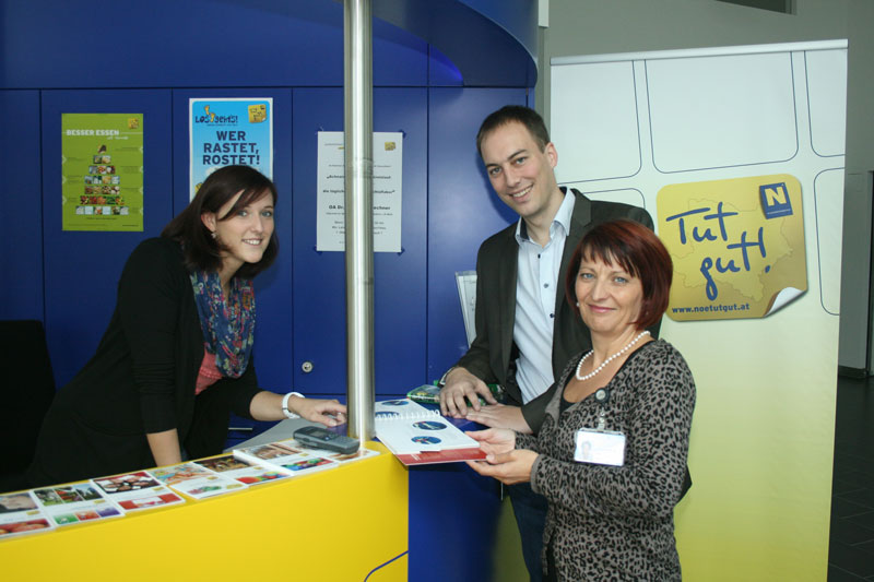 Das Land NÖ engagiert sich seit Jahren im Bereich der Gesundheitsförderung und Prävention. Die Initiative »Tut gut!« agiert dabei als Drehscheibe. Im Rahmen eines Pilotprojektes am LK Waidhofen/Ybbs übernimmt die Gesundheitskoordinatorin Mag. Ulrike Gruber die Planung und Umsetzung der betrieblichen Gesundheitsförderung. Am Info-Stand im Eingangsbereich können sich MitarbeiterInnen, PatientInnen und BesucherInnen wertvolle Tipps zum Thema Gesundheit holen und erhalten auch Informationsmaterialien zum Thema Gesundheitsvorsorge.