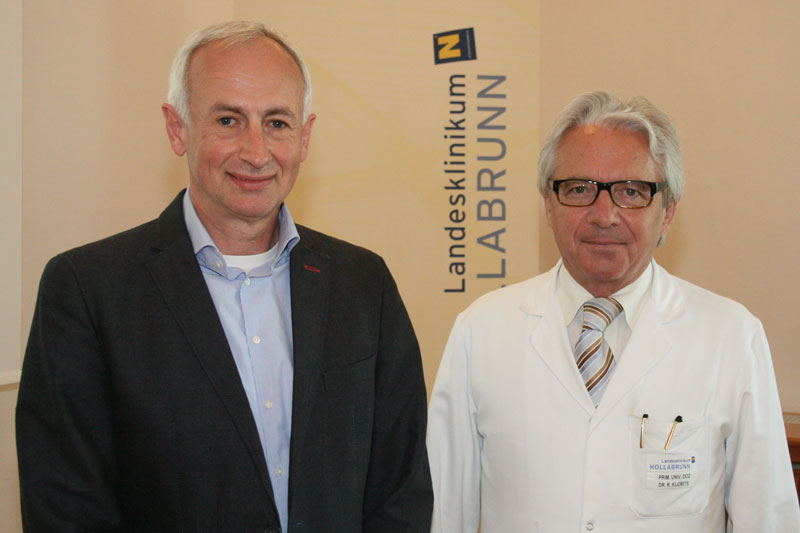 (v.l.) Bezirksinspektor Karl Zederbauer vom Landeskriminalamt Niederösterreich wurde vom Ärztlichen Direktor des Landesklinikums Hollabrunn Primarius Univ.-Doz. Dr. Rudolf Kuzmits begrüßt