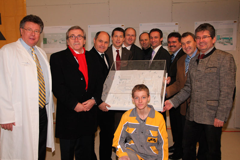 Mit einem Modell des Landesklinikums Mistelbach-Gänserndorf nach dem Zu- und Umbau: (v.l.) Prim. Univ.-Doz. Dr. Otto Traindl, Ärztlicher Direktor, Dipl. KH-BW Josef Kober, Kaufm. Direktor, LH-Stv. Mag. Wolfgang Sobotka, LAbg. Mag. Kurt Hackl, Bgm. Dr. Alfred Pohl, NR Mag. Hubert Kuzdas, Regionalmanager DI Jürgen Tiefenbacher, LAbg. Ing. Manfred Schulz, Betriebsratsobmann Eduard Böhm, Pflegedirektor DGKP Josef L. Strobl, akad. PD, und Stefan Vavrovec, Lehrling Alpine