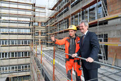 Philipp Plank von der ARGE Strabag AG – Porr Bau GmbH mit Landesrat Mag. Karl Wilfing bei der Besichtigung der Baustelle von Haus C am Universitätsklinikum St. Pölten