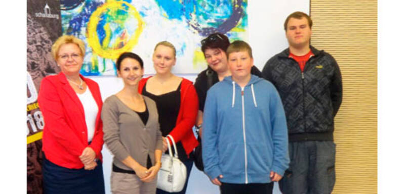 Christina Skorianz, Fabian Dastl, Thomas Glaser und Carina Just informierten sich mit der Leiterin des Gmünder Jugendzentrums Sabrina Mikscha (2.v.l.) bei Pflegestandortleiterin Herta Weissensteiner MBA über Pflegeberufe.
