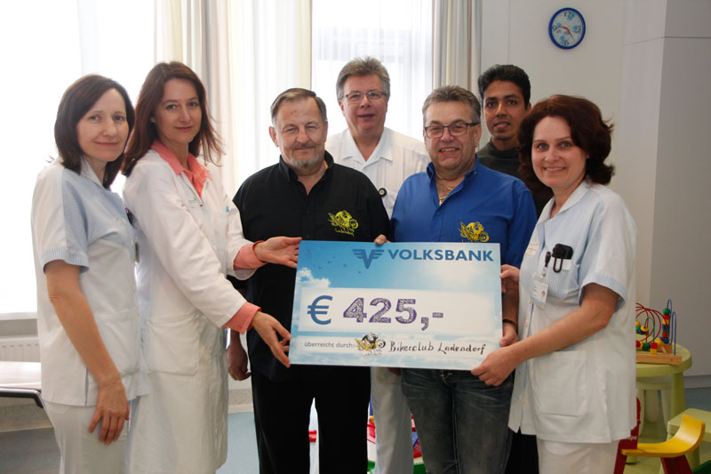 Obmann Anton Ludwig und Schriftführer Herbert Stubenvoll sowie der Initiator der Sternwallfahrt, Pater Roger aus Paasdorf stellten sich auf der Kinder- und Jugendabteilung des Landesklinikums Mistelbach-Gänserndorf mit einer großzügigen Spende ein. 425 Euro sammelten sie auf einer Sternwallfahrt mit Motorrädern von Ladendorf nach Mariazell, sowie mit dem Verkauf von DVDs der Wallfahrt. 50 Motorräder mit rund 70 Teilnehmern waren bei der Benefiz-Ausfahrt dabei.