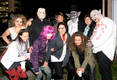 Daniela Schnell, Direktorin der Gesundheits- und Krankenpflegeschule (hinten Mitte), begrüßte mit ihren Lehrern einige „gruselige Gestalten“ zum gemeinsamen Nachmittag.