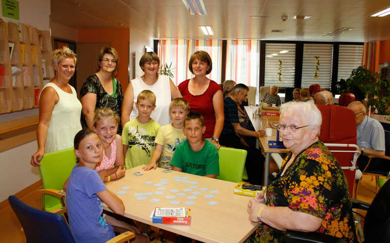 (v.l.) Die Kinder Sarah Himmer, Madeleine Pöcher, Colin Moser, Philip Strondl und Marius Wandl spielen mit Patientin Irmgard Berger „Memory“. Stehend: Sonja Moser, Marianne Leutner (Büchereileiterin), Silvia Müller (Büchereimitarbeiterin), und DGKS auf der RNS Ingrid Strondl