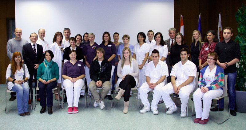Mag. Ferdinand Schönfelder, Mag. (FH) Herbert Karner, QM DGKS Ginny Weber, MAS, und der Ärztliche Direktor Prim. Univ. Doz. Dr. Paul Chrisitan Hajek (stehend 5.v.r.) begrüßten die neuen Mitarbeiterinnen und Mitarbeiter Gneist Sebastian, Mohl Sascha, Höller Andreas, Tammegger Benjamin, Tschürtz Kevin, Ruß Elke, Steiger Sandra, Mayer Nina, Strebl Claudia, Halibono Serdea, Hofstädter Susanne, Strobl Lisa-Maria, Mick Stephanie, Kornfeld Stephanie, Amring Hedwig, Trofer Julia, Kogelbauer Uwe, Knotzer Katharina, Mikulits Nicole, Pfannenstill Ingrun und Andrsch-Raith Eva.